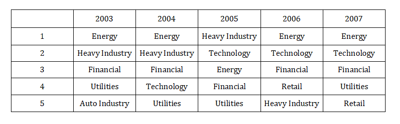 The table shown gives details of the top five industries in each year from 2003 to 2007. Seven different sectors appear within the table, with two appearing every year (energy and finance), whilst the auto-industry makes just a singular appearance – fifth, in 2003.